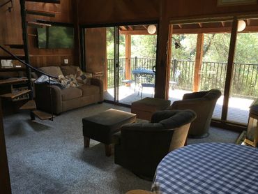 The Guest House is a completely separate house with 3 bedrooms (two queens and a set of bunkbeds), two baths, living room, and a compact but complete kitchen with full size refrigerator, stove, microwave, etc. The master bedroom suite has a small private deck. The second queen is in the sleeping loft located over the living area, accessed by a circular stairway. If going up the circular stairway is daunting, there is an additional bedroom on the main floor with a bunkbed set (adult on bottom only, please). There is central heating and air conditioning throughout. The living room has a gas fireplace for atmosphere. On the lower level, accessed from outside, is an authentic Swedish sauna, another half-bath, and full size washer and dryer. The house has a four adult limit. All linen and towels are provided.